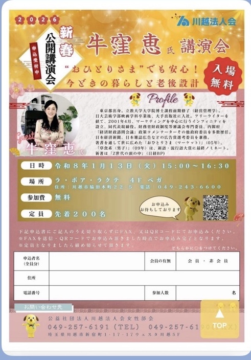 1月13日(火)ラボアラクテ15時から川越法人会新春講演会が行われる。講師は牛窪恵さん。